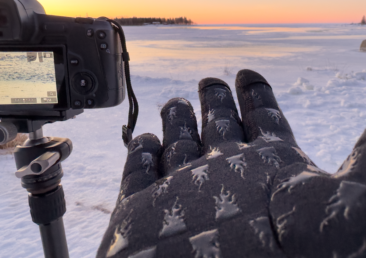 The key to staying warm when taking pictures in the cold is layering. The gloves I use have a three-layer design, with a durable and water-resistant outer layer, an insulating middle layer, and a soft inner layer that wicks away moisture. This combination keeps my hands dry and warm even in the most extreme temperatures. Additionally, these gloves are made from very warm and soft Merino Power Wool, which is highly breathable, keeping your skin dry and naturally anti-odour.