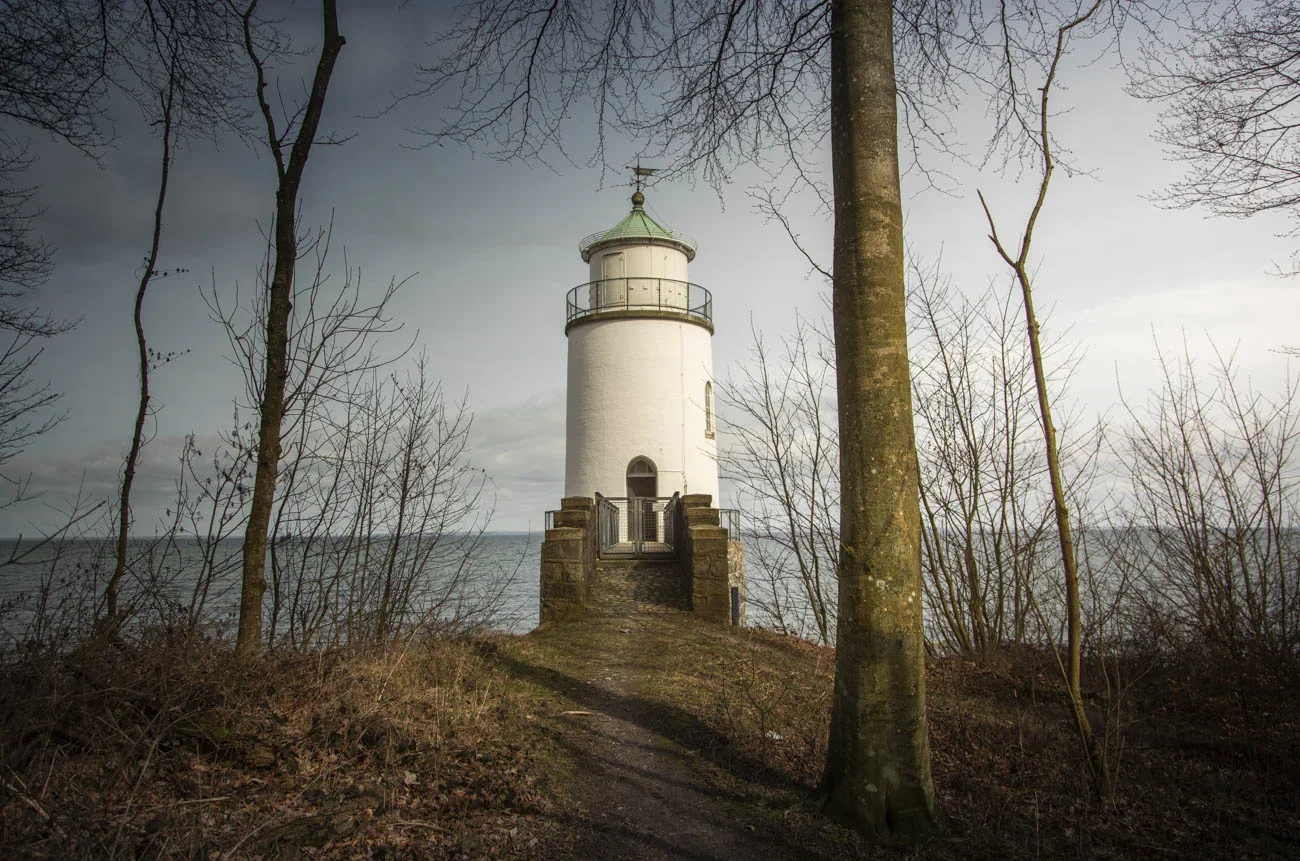 The idyllic lighthouse of Taksensand at the edge of the forest.