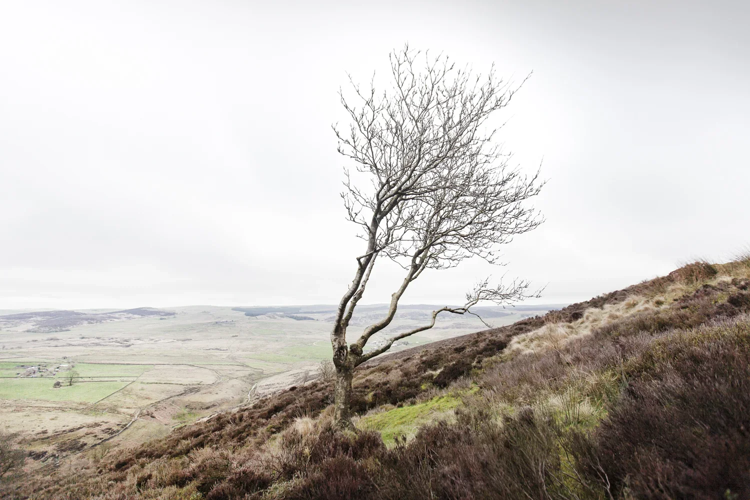 The landscape in the roaches is mainly moorland and very unforgiving. The weather can also change very quickly and can be unforgiving too, with low cloud often surrounding you in an instance. You need to be prepared with suitable outdoor gear and read for anything 'mother nature' might throw at you. The landscape flora is mainly heather, it stretches for miles and changes colour from season to season. Lone trees are found here and there and just where the road drops down the valley on the other side, I see a beauty. Maybe I'm strange, but I do love a 'lone tree'. Sitting here all alone I cannot help but stop and capture this beauty, so interesting and so perfect for the picture below.