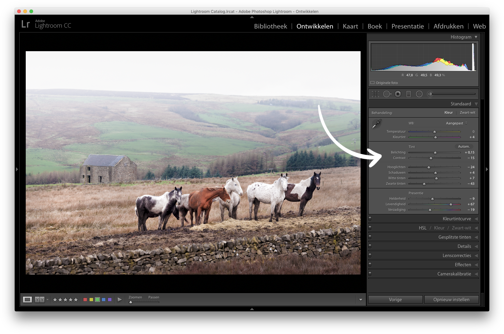 My first image shows some beautiful horses found on the rugged Peak District farmland, close to the Roaches. I shot this image in raw and completed basic edits in Lightroom that made a powerful impact. I wanted to focus more on the brown horse and allow it to stand out. I did this by adding light with the local brush, adjusting the general clarity to get more detail and saturating the colours with the sliders, all in the basic adjustment panel.