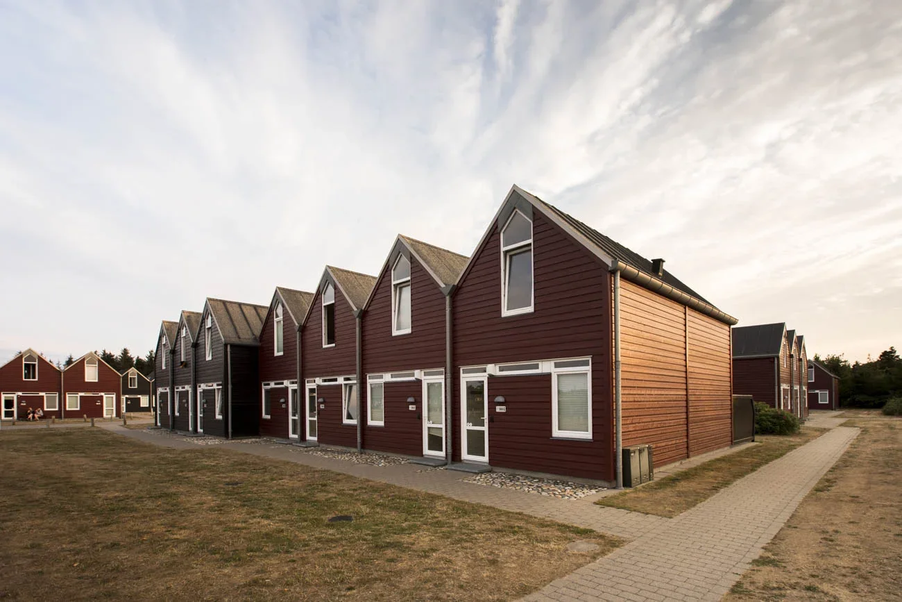 The comfortable red houses at the park are built in a traditional, simplistic Scandinavian style.