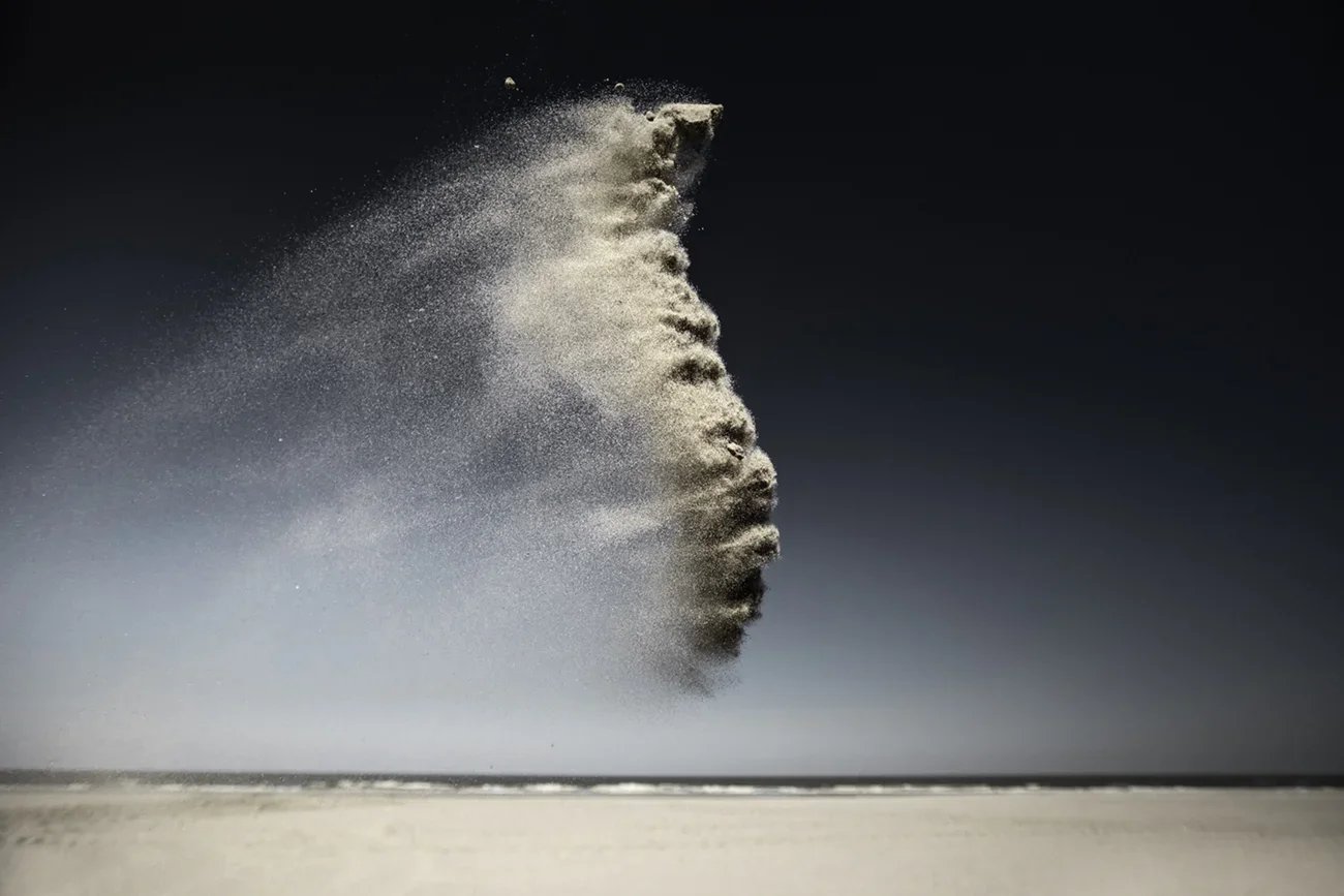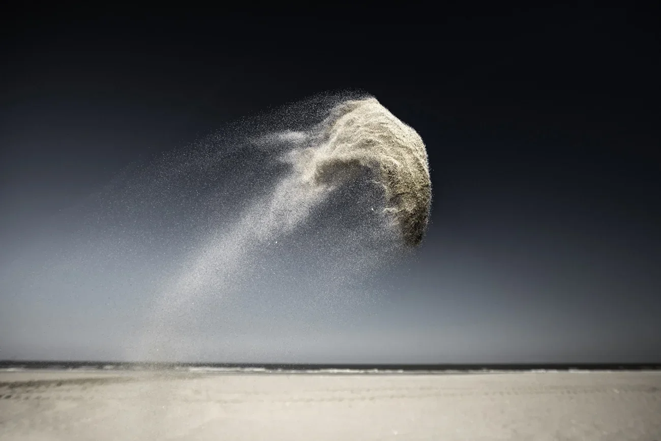 Sand Creatures, which led me to these newborn photoseries. Just like ‘Sand Creatures I’, these are captured on beaches in Holland, and contain landscape, natural elements and zero gravity. The Sand Creatures series focuses on nature in an unexpected way. The explosive and at times powdery scenes of the grainy sand being thrown into the air can be taken as a manifesting life form, and they become sand creatures.
